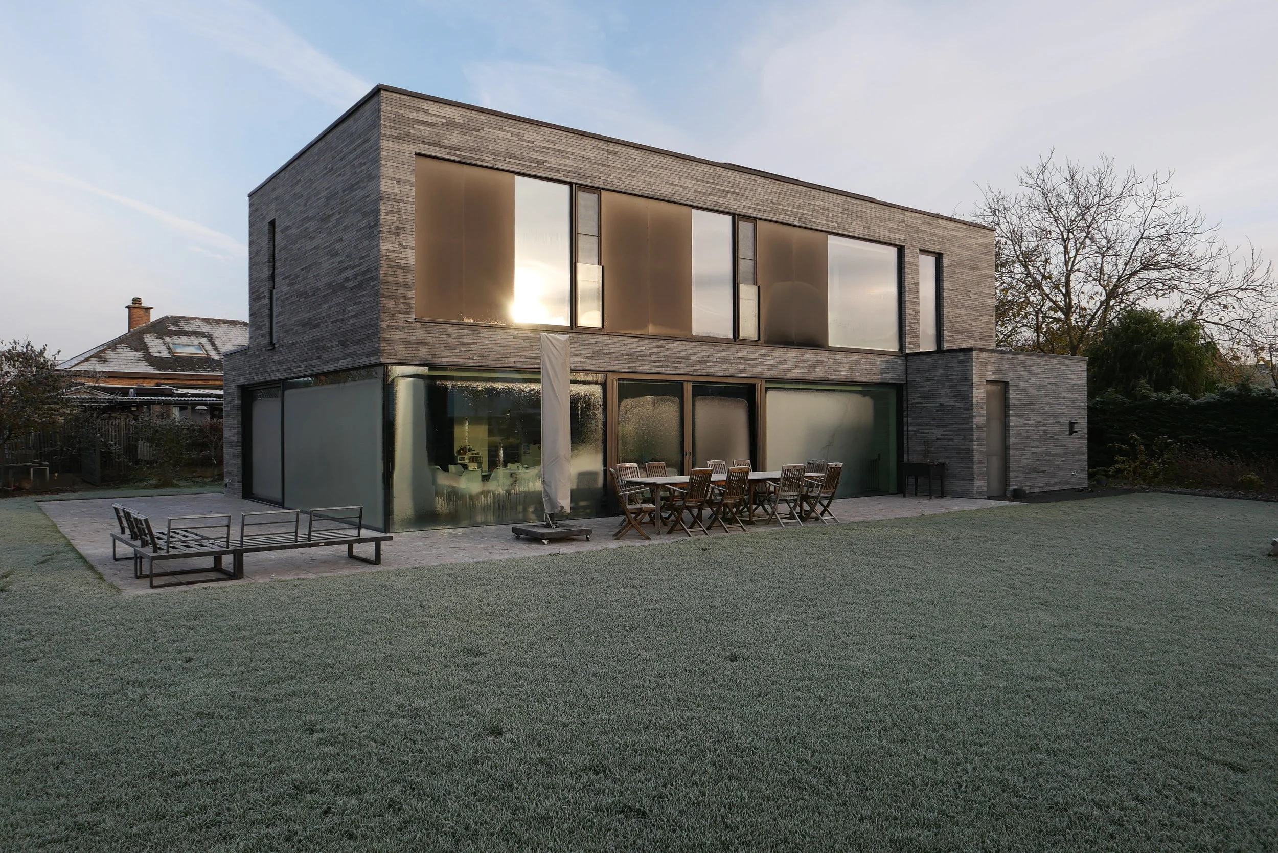 De woning volgt de opgelegde rooilijnen en bouwzones nauwgezet, maar weet binnen die grenzen een uitzonderlijk gevoel van openheid en privacy te creëren. Het strakke volume met plat dak en grijze gevelsteen ademt eenvoud en rust, waardoor de architectuur zich moeiteloos verankert in haar groene omgeving.